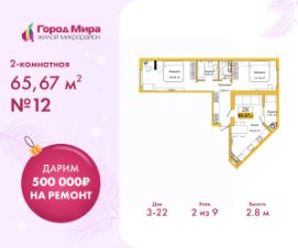 Просторная 2-комн. квартира с предчистовой отделкой в ЖМ "Город Мира" на 2 этаже. Общая площадь: 65.67 кв.м., жилая: 30.01 кв.м., площадь просторной кухни-столовой: 18.42 кв.м. Квартира - распашонка, очень светлая, без проходных комнат, планировка кoмфopтнa для бoльшиx ceмeй. В квартире одна лоджия, один совмещенный и один раздельный санузел. Высота потолков 2.8 м.