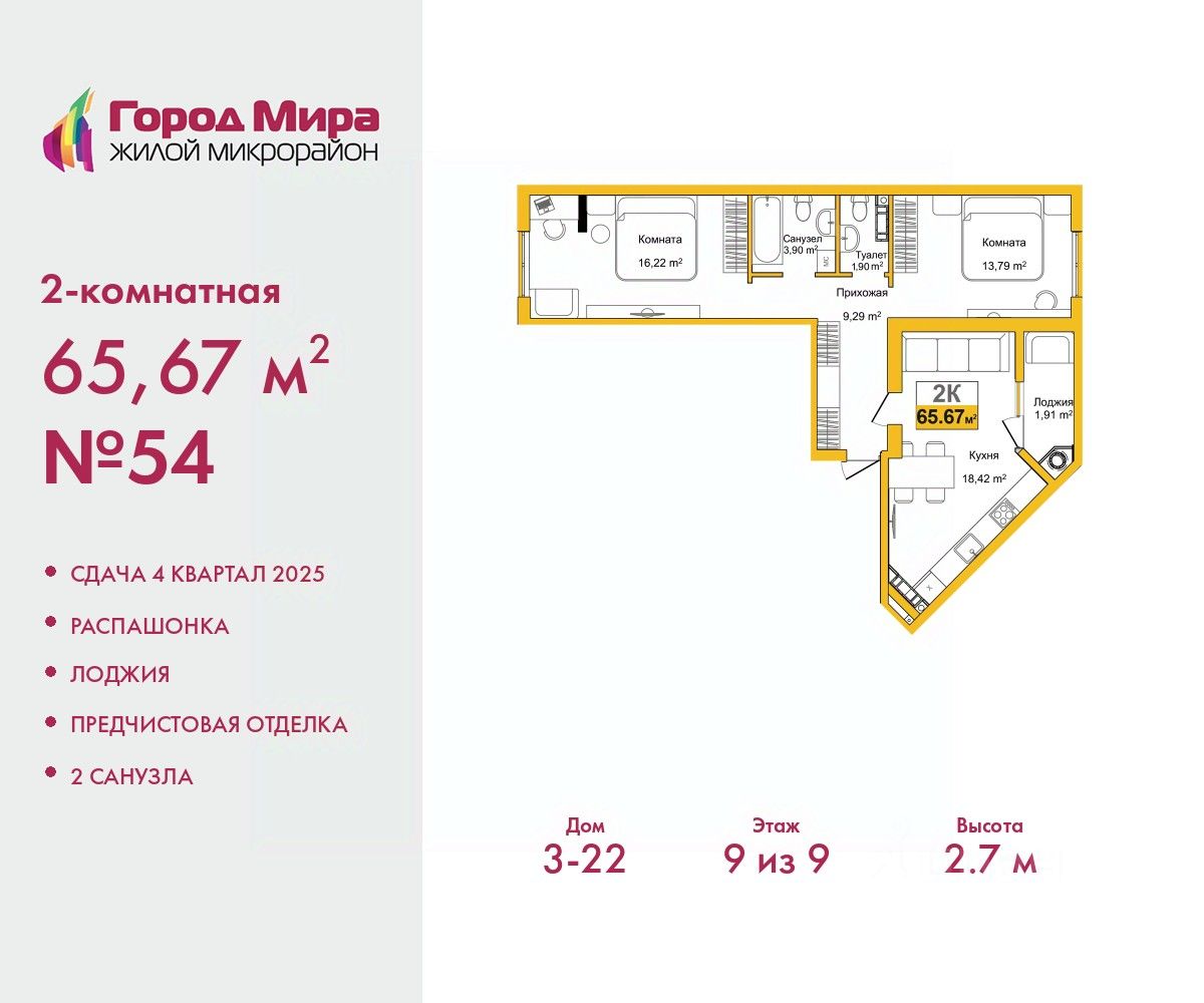 Двухкомнатная квартира с предчистовой отделкой в ЖМ "Город Мира" на 9 этаже. Общая площадь: 65.67 кв.м., жилая: 30.01 кв.м., площадь просторной кухни-столовой: 18.42 кв.м. Квартира - распашонка, без проходных комнат, окна выходят на paзные стороны дома. В квартире одна лоджия, один совмещенный и один раздельный санузел. Высота потолков 2.7 м.