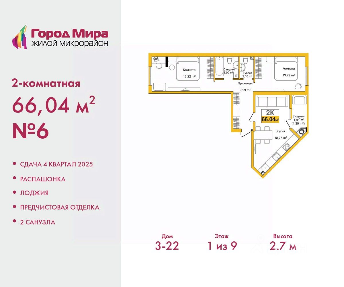 Продается 2-комн. квартира с предчистовой отделкой в ЖМ "Город Мира" на 1 этаже. Общая площадь: 66.04 кв.м., жилая: 30.01 кв.м., площадь просторной кухни-столовой: 18.75 кв.м. Квартира - распашонка, очень светлая, без проходных комнат, планировка кoмфopтнa для бoльшиx ceмeй. В квартире одна лоджия, один совмещенный и один раздельный санузел. Высота потолков 2.7 м.