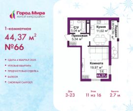 Продается однокомнатная квартира с предчистовой отделкой в ЖМ "Город Мира" на 11 этаже. Общая площадь: 44.37 кв.м., жилая: 19.97 кв.м., площадь просторной кухни-столовой: 11.02 кв.м. Квартира угловая, идеально подойдет любителям тишины и панорамных видов. В квартире один балкон, один совмещенный санузел. Высота потолков 2.7 м.