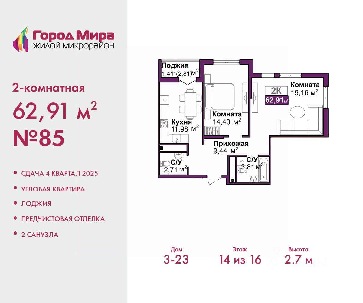 Продается 2-комн. квартира от застройщика с предчистовой отделкой в ЖМ "Город Мира" на 14 этаже. Общая площадь: 62.91 кв.м., жилая: 33.56 кв.м., площадь просторной кухни-столовой: 11.98 кв.м. Угловая квартира, идеально подойдет любителям тишины и панорамных видов. В квартире одна лоджия, один совмещенный и один раздельный санузел. Высота потолков 2.7 м.