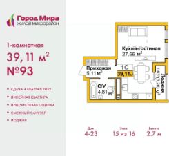 Продается однокомнатная квартира с предчистовой отделкой в ЖМ "Город Мира" на 15 этаже. Общая площадь: 39.11 кв.м., жилая: 22.56 кв.м., площадь кухни: 5 кв.м. Все окна выходят на одну сторону. В квартире одна лоджия, один совмещенный санузел. Высота потолков 2.7 м.