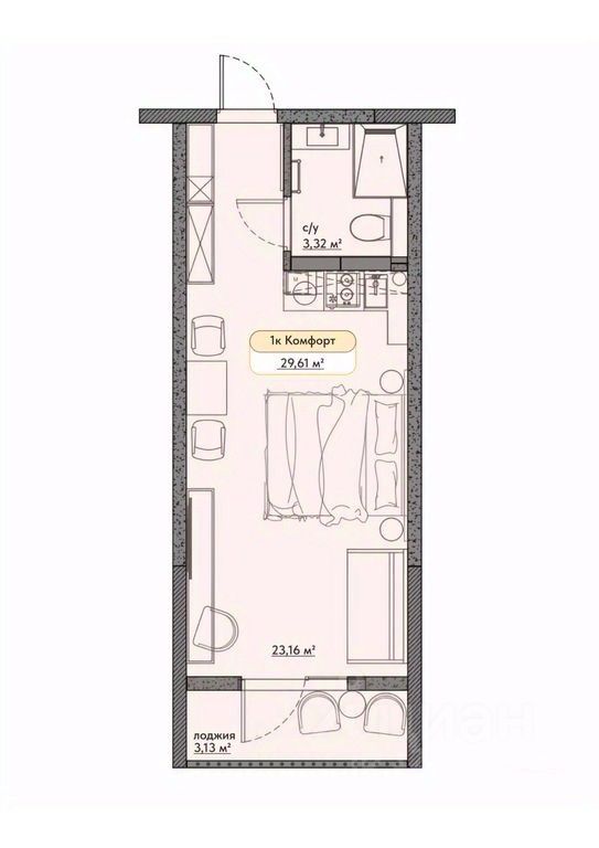 Жилая площадь: 26.49 кв.м, кухня - 2 кв.м. чистовая отделка. , окна выходят на улицу.