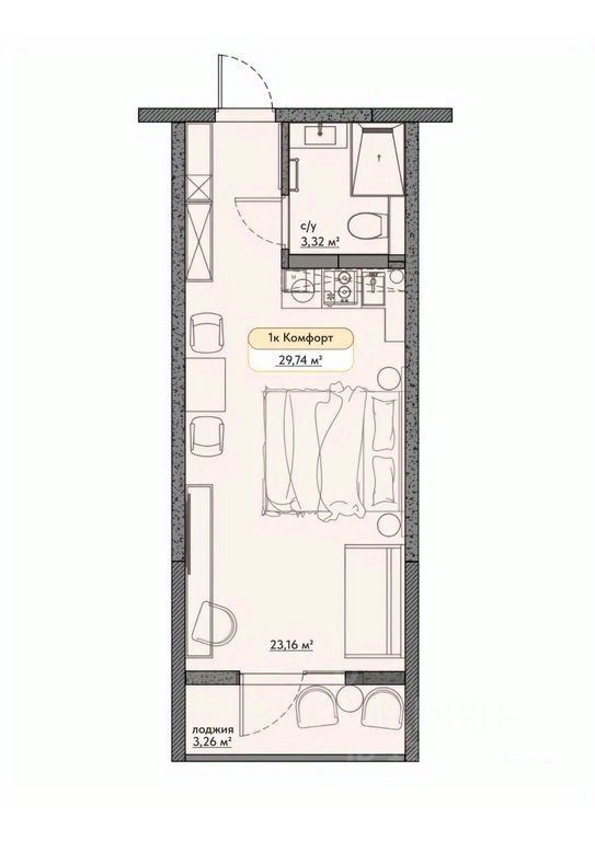 Жилая площадь: 26.48 кв.м, кухня - 2 кв.м. помещение требует ремонта. , окна выходят на улицу.