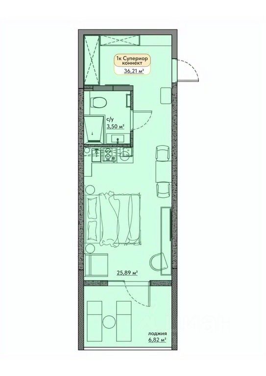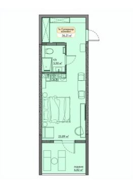 Жилая площадь: 22.35 кв.м, кухня - 2 кв.м. черновая отделка. , окна выходят на улицу.