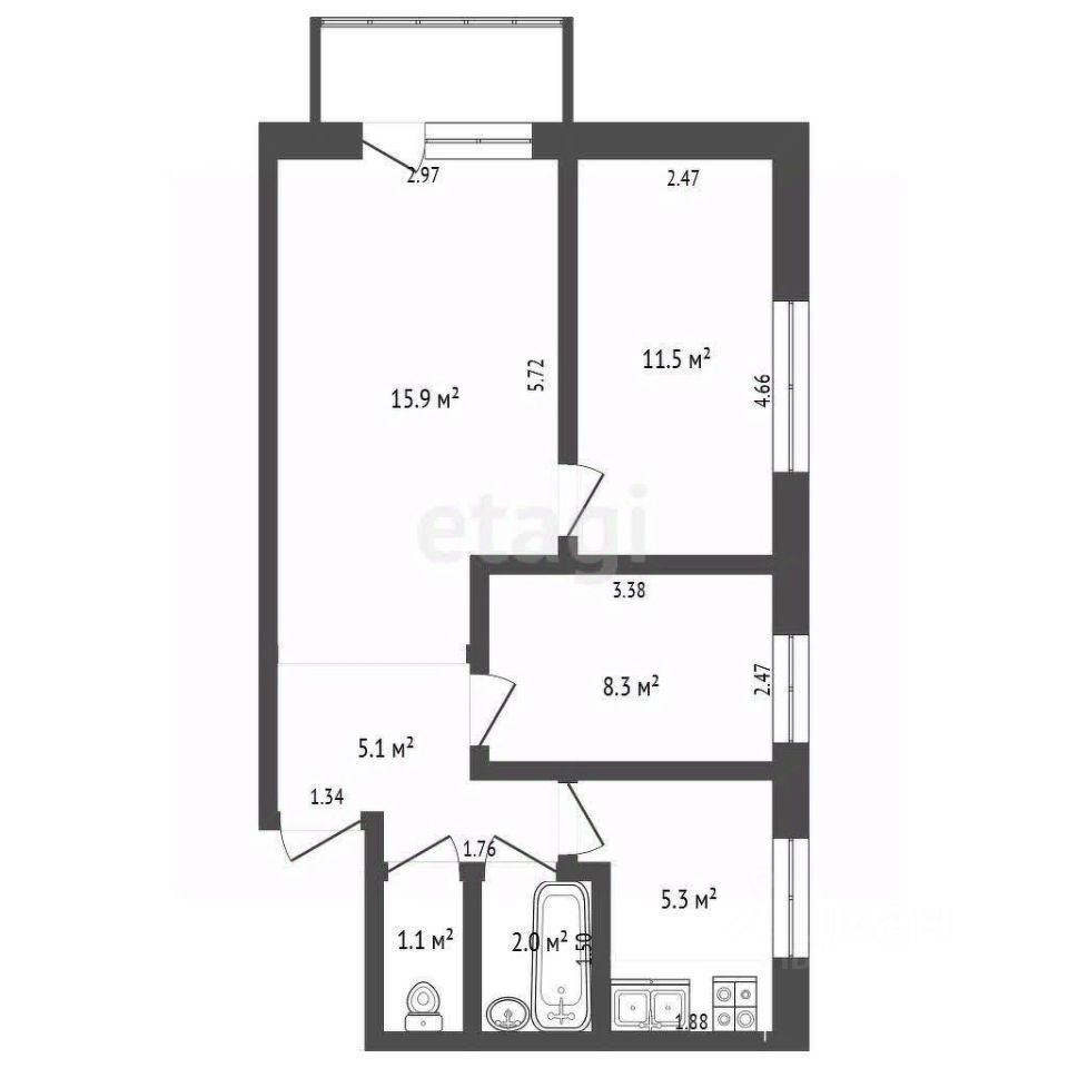 Площадь кухни составляет 5,3 кв.м по планировке, но произведена реконструкция, за счет межкомнатной стены увеличили площадь кухни, с возможностью зонирования под столовую или гостиную.