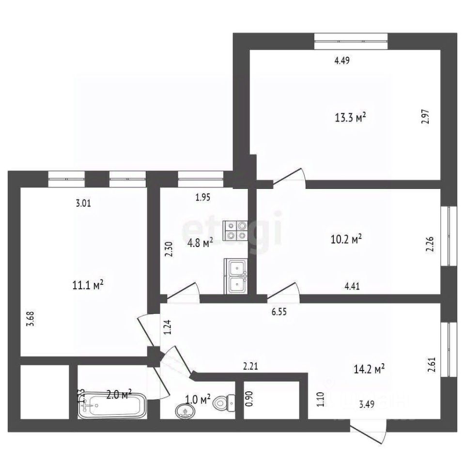 Квартира находится на втором этаже трехэтажного кирпичного дома 1908 года постройки. Общая площадь составляет 56.6 кв. м, из которых 7 кв. м отведено под кухню. Высокие потолки — 4.8 метра — создают ощущение простора и свободы.