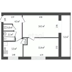 Комнаты изолированные площадью 14,5 кв.м. и 11,4 кв.м. В квартире косметический ремонт, газовая плита и колонка, центральное водоснабжение. Установлен двухконтурный котел. Квартира теплая и светлая, окна с видом на море и в тихий зеленый двор. Утепленная застекленная лоджия с кладовкой. Санузел совмещённый. Дом после качественного капитального ремонта (новая кровля, утепление и штукатурка наружных стен, косметический ремонт подъезда).