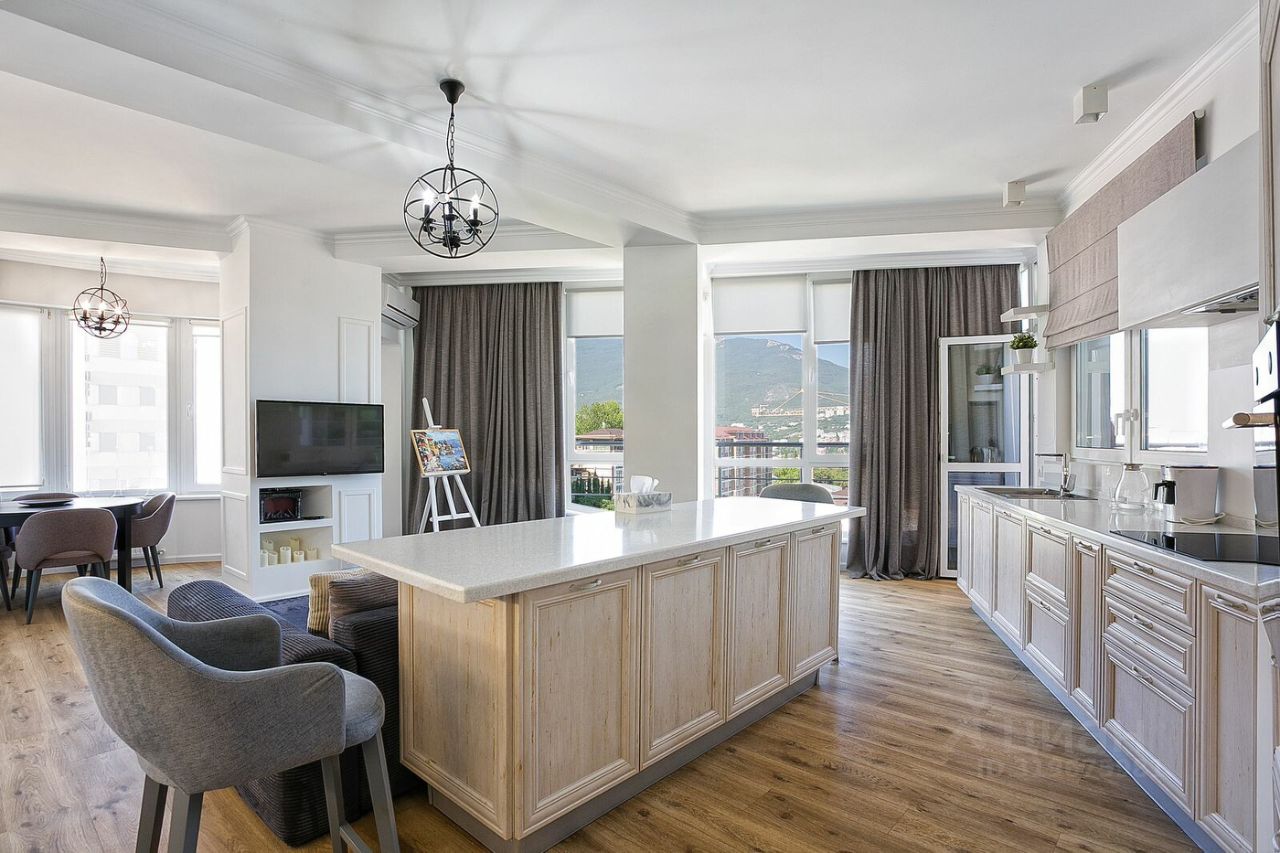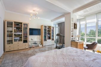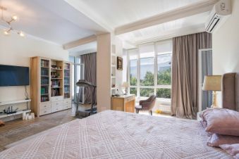 Преимущество квартиры заключается не только в панорамном морском и горном пейзажах, но и в отделке, реализованной с использованием высококачественных материалов в классическом стиле. Интерьер полностью укомплектован мебелью и техникой Gorenje, Bosch, Daikin.
