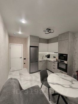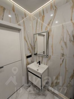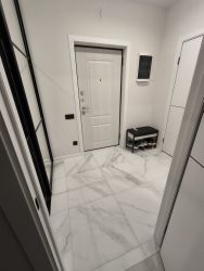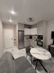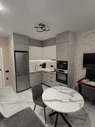 В апартаментах выполнен дизайнерский ремонт в светлых тонах с использованием качественных материалов. Совмещенный санузел выполнен в стильном мраморном оформлении, оснащён душевой кабиной и качественной сантехникой. В прихожей предусмотрена гардеробная для удобного хранения вещей. На кухне установлена стильная мебель и современное оборудование, включая варочную панель и духовой шкаф.
