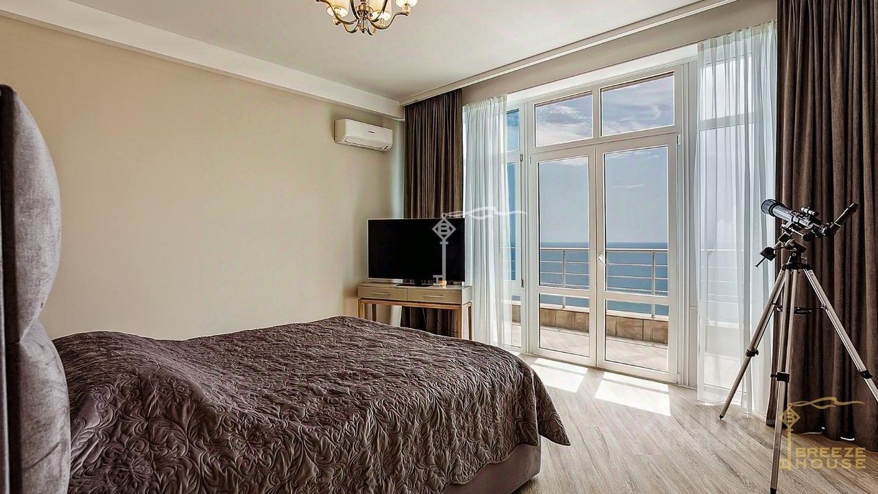 Планировка: прихожая, просторная гостиная совмещенная с кухней, выход на открытую террасу, 2 спальни с панорамными окнами и выходом на балкон, два санузла (один с ванной и панорамными окнами, второй с душевой), гардеробная, хоз. помещение.