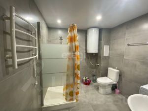 Санузел совместный, просторный с душевой кабиной, отделан керамической плиткой.