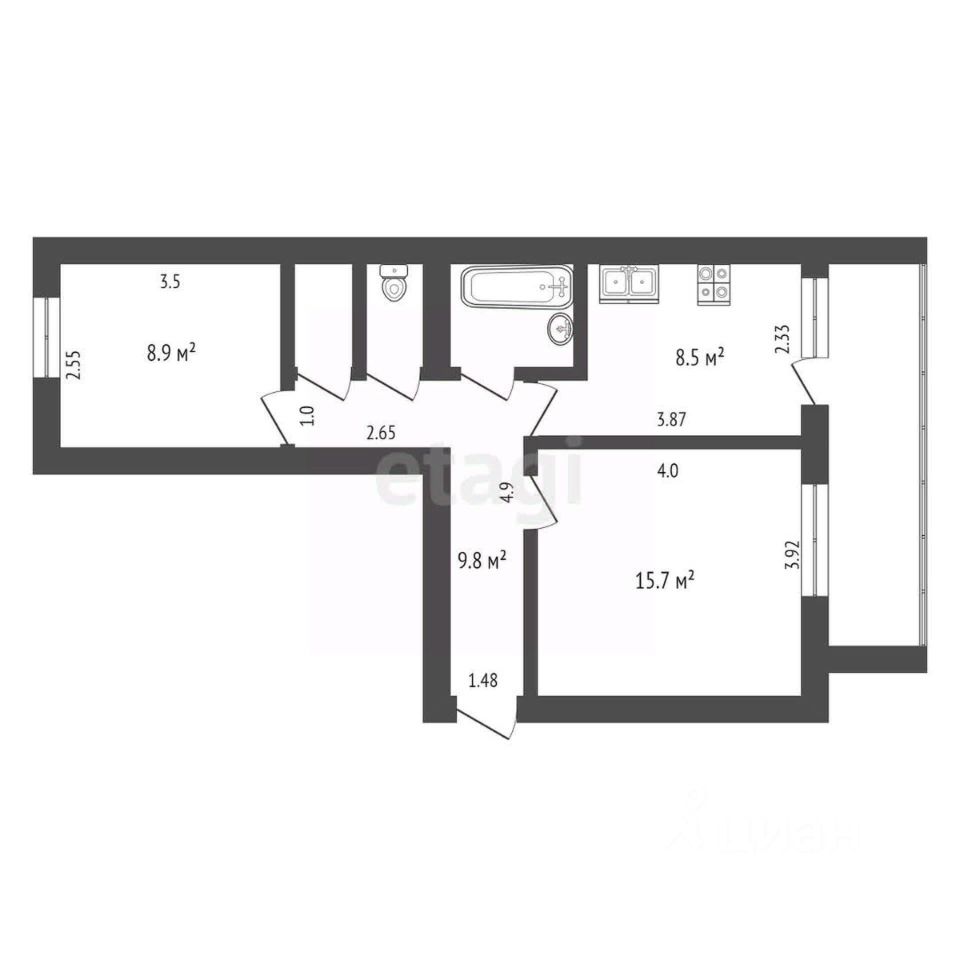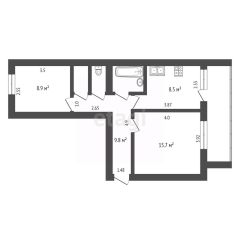 В квартире две раздельные комнаты 15.7 кв.м. и 8,9 кв.м., большой коридор 9.8 кв.м. и кухня 8.5 кв.м.