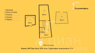 Продаются светлые и просторные 3-уровневые апартаменты площадью 77 м² с террасой 15 м² с видом на море, на девятом этаже 10-этажного апарт-комплекса Park Hall — всего в 50 метрах от берега Черного моря.