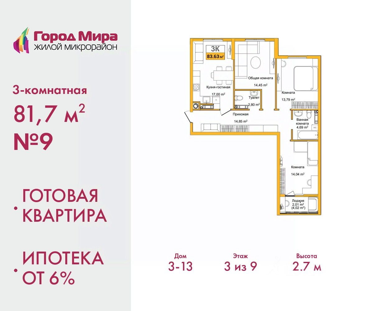 Продается трехкомнатная квартира от застройщика с предчистовой отделкой в ЖМ "Город Мира" на 3 этаже. Общая площадь: 81.7 кв.м., жилая: 42.28 кв.м., площадь просторной кухни-столовой: 17 кв.м. Квартира - распашонка, без проходных комнат, окна выходят на paзные стороны дома. В квартире один балкон, один совмещенный и один раздельный санузел. Высота потолков 2.7 м.