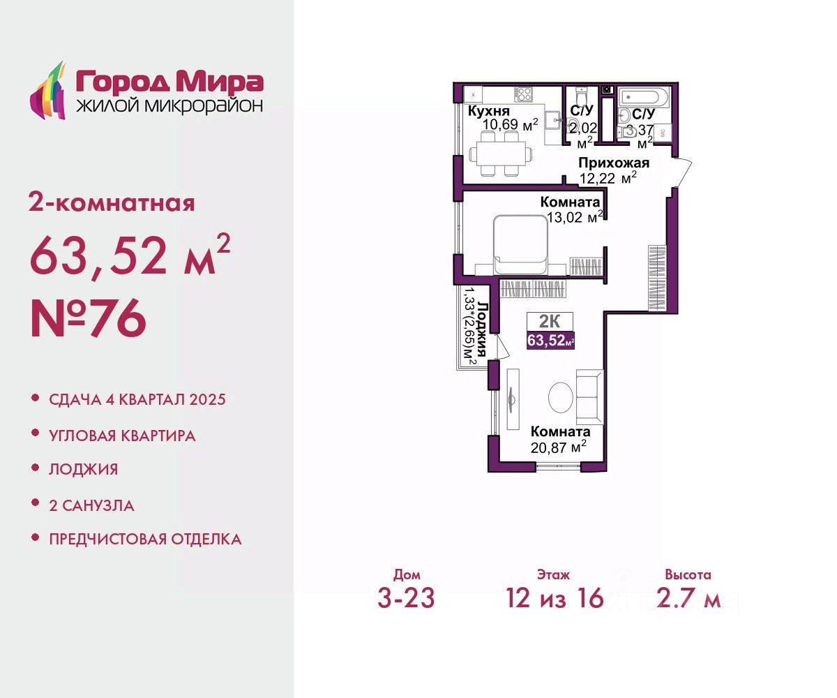 Просторная двухкомнатная квартира с предчистовой отделкой в ЖМ "Город Мира" на 12 этаже. Общая площадь: 63.52 кв.м., жилая: 33.89 кв.м., площадь просторной кухни-столовой: 10.69 кв.м. Угловая квартира, идеально подойдет любителям тишины и панорамных видов. В квартире одна лоджия, один совмещенный и один раздельный санузел. Высота потолков 2.7 м.