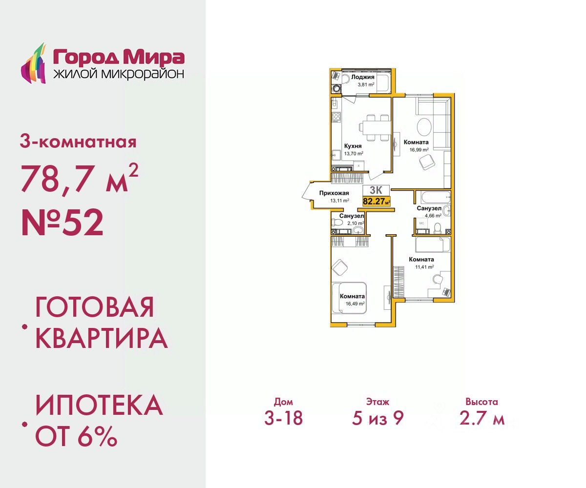 3-комн. квартира от застройщика с предчистовой отделкой в ЖМ "Город Мира" на 5 этаже. Общая площадь: 78.7 кв.м., жилая: 29.89 кв.м., площадь просторной кухни-столовой: 13.7 кв.м. Квартира - распашонка, без проходных комнат, окна выходят на paзные стороны дома. В квартире один балкон, один совмещенный и один раздельный санузел. Высота потолков 2.7 м.