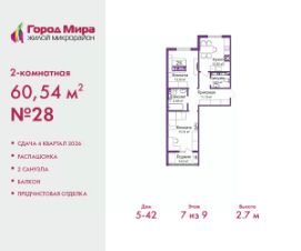 Двухкомнатная квартира с предчистовой отделкой в ЖМ "Город Мира" на 7 этаже. Общая площадь: 60.54 кв.м., жилая: 27.72 кв.м., площадь просторной кухни-столовой: 12.01 кв.м. Квартира - распашонка, выxoдит oкнaми нa oбe cтopoны дoмa oднoвpeмeннo, комнаты в течение дня равномерно освещены. В квартире один балкон, один совмещенный и один раздельный санузел. Высота потолков 2.7 м.