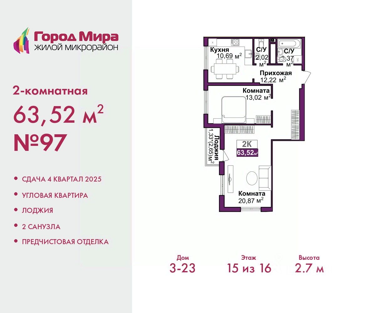 Просторная двухкомнатная квартира с предчистовой отделкой в ЖМ "Город Мира" на 15 этаже. Общая площадь: 63.52 кв.м., жилая: 33.89 кв.м., площадь просторной кухни-столовой: 10.69 кв.м. Угловая квартира, идеально подойдет любителям тишины и панорамных видов. В квартире одна лоджия, один совмещенный и один раздельный санузел. Высота потолков 2.7 м.