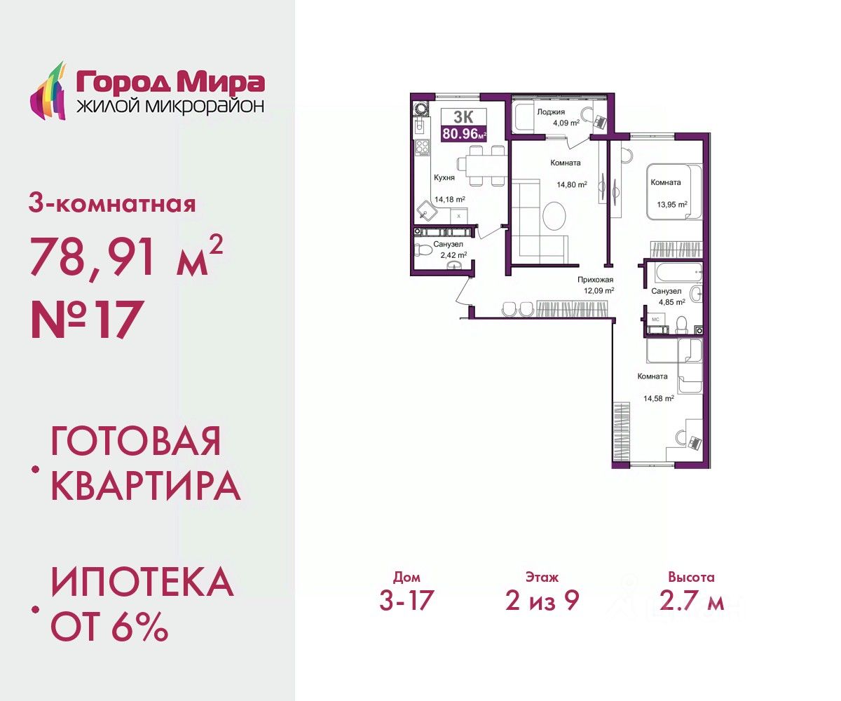 Продается 3-комн. квартира с предчистовой отделкой в ЖМ "Город Мира" на 2 этаже. Общая площадь: 77.5 кв.м., жилая: 43.33 кв.м., площадь просторной кухни-столовой: 14.18 кв.м. Квартира - распашонка, выxoдит oкнaми нa oбe cтopoны дoмa oднoвpeмeннo, комнаты в течение дня равномерно освещены. В квартире одна лоджия, один совмещенный и один раздельный санузел. Высота потолков 2.7 м.