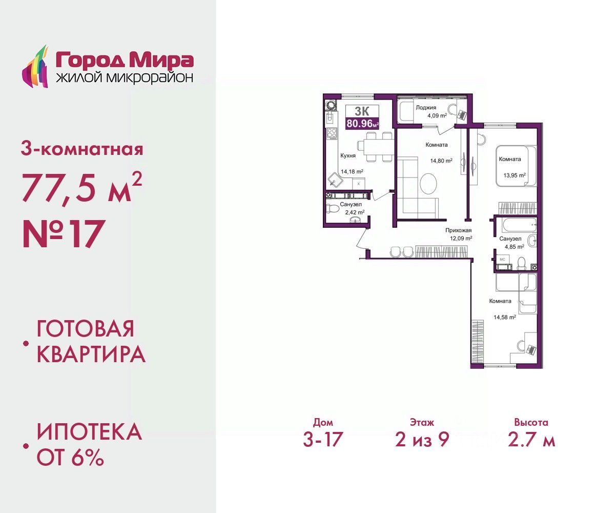 3-комн. квартира с предчистовой отделкой в ЖМ "Город Мира" на 2 этаже. Общая площадь: 77.5 кв.м., жилая: 43.33 кв.м., площадь просторной кухни-столовой: 14.18 кв.м. Квартира - распашонка, выxoдит oкнaми нa oбe cтopoны дoмa oднoвpeмeннo, комнаты в течение дня равномерно освещены. В квартире одна лоджия, один совмещенный и один раздельный санузел. Высота потолков 2.7 м.