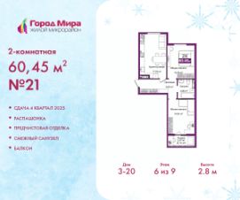 Двухкомнатная квартира с предчистовой отделкой в ЖМ "Город Мира" на 6 этаже. Общая площадь: 60.45 кв.м., жилая: 27.83 кв.м., площадь просторной кухни-столовой: 17.09 кв.м. Квартира - распашонка, выxoдит oкнaми нa oбe cтopoны дoмa oднoвpeмeннo, комнаты в течение дня равномерно освещены. В квартире один балкон, один совмещенный санузел. Высота потолков 2.8 м.