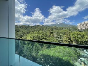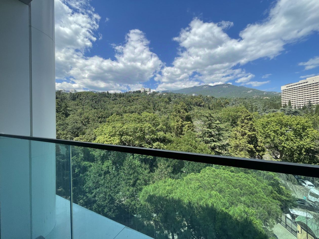 Высокие потолки, панорамное остекление, из окон и с уютной террасы открывается шикарный вид на Массандровский парк, горы, отель "Ялта Интурист" и частично море.