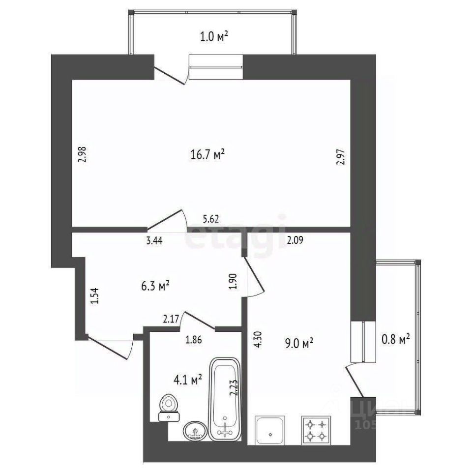 Площадь квартиры 36 м2, кухня площадью 9м2. Есть 2 балкона.