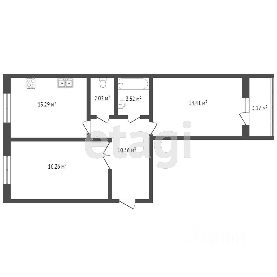 Максимально изолирована от соседей и меет самую практичную планировку - распашонка: окна на обе стороны дома. Общая площадь 61 кв.м, жилая 30 кв.м, кухня 13 кв.м, лоджия 3 кв.м.