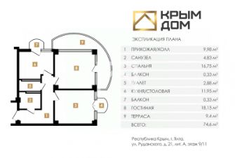 Квартира (74,6 м²) расположена на 7 этаже 11-этажного дома. Ключевыми преимуществами квартиры являются — прекрасные видовые характеристики, расположение в пешей доступности до всей городской инфраструктуры и центральной набережной, а также функциональное планировочное решение.