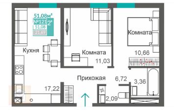 Квартира имеет смежную планировку с двумя просторными комнатами. Жилая площадь составляет 21 м², а площади комнат — 12 м², что обеспечивает достаточно пространства для вашего комфорта. Кухня площадью 17 м² станет настоящим семейным уютом, где можно готовить и проводить время с близкими. Высота потолков в 2.8 метра создаст ощущение простора и света.