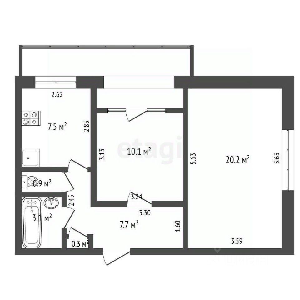 Светлая и уютная жилая площадь составляет 30,3 кв.м, площадь кухни - 7,5 кв.м. Санузел - раздельный, площадь ванной составляет 3,1 кв.м, туалета - 0.9 кв.м. Просторная лоджия, площадь которой 6,25 кв.м, позволит использовать ее как дополнительную комнату или место для отдыха.