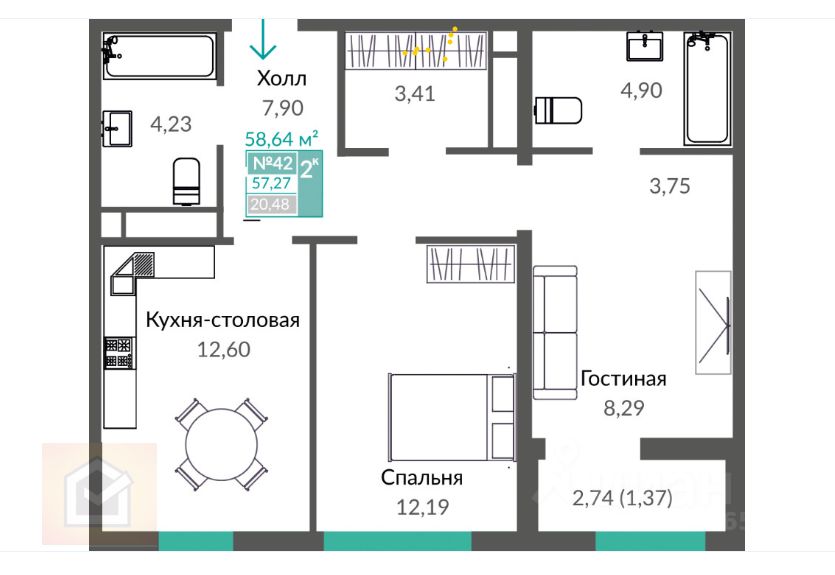 Эта квартира с изолированной планировкой идеально подойдет для комфортной жизни. **Общая площадь** квартиры составляет 58 м², из которых **жилая площадь** — 30 м², и **кухня** площадью 12.5 м² станет вашим любимым местом для готовки и семейных сборищ. Высота потолков в 2.8 м создает ощущение простора и свободы.