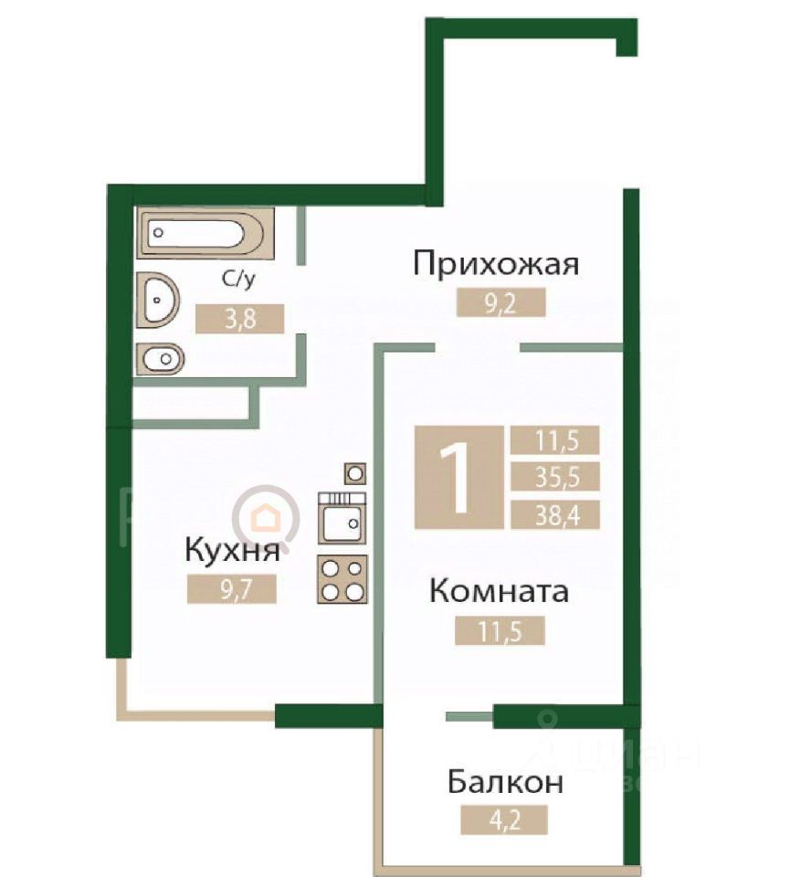 • Общая площадь: 38 м²