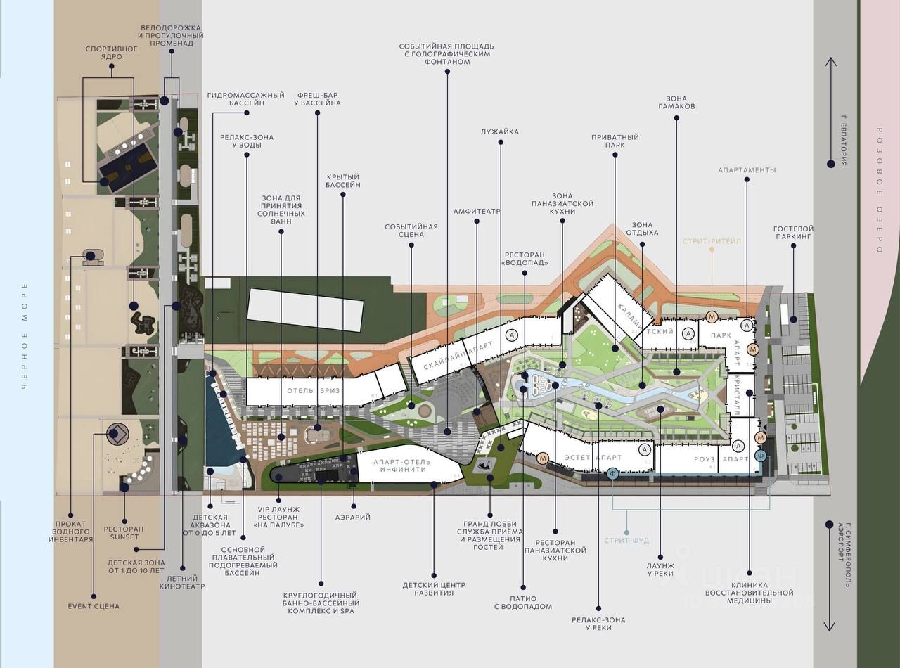-Широкая пляжная зона с соляриями и спортивно-игровыми площадками;