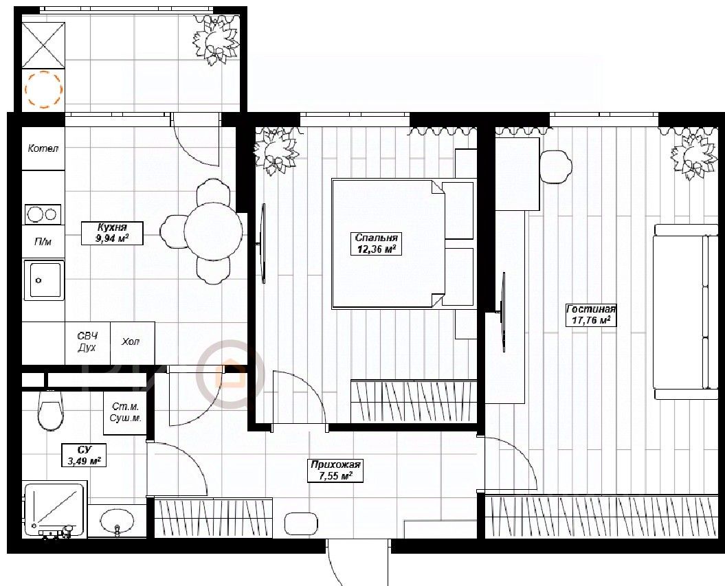 • Общая площадь: 55 м²