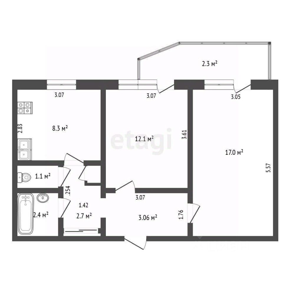 Квартира имеет изолированные комнаты площадью 17 кв.м. и 12 кв.м., а также кухню размером 8,3 кв.м. Просторная лоджия добавляет дополнительное удобство, а раздельный санузел позволяет организовать пространство более функционально.