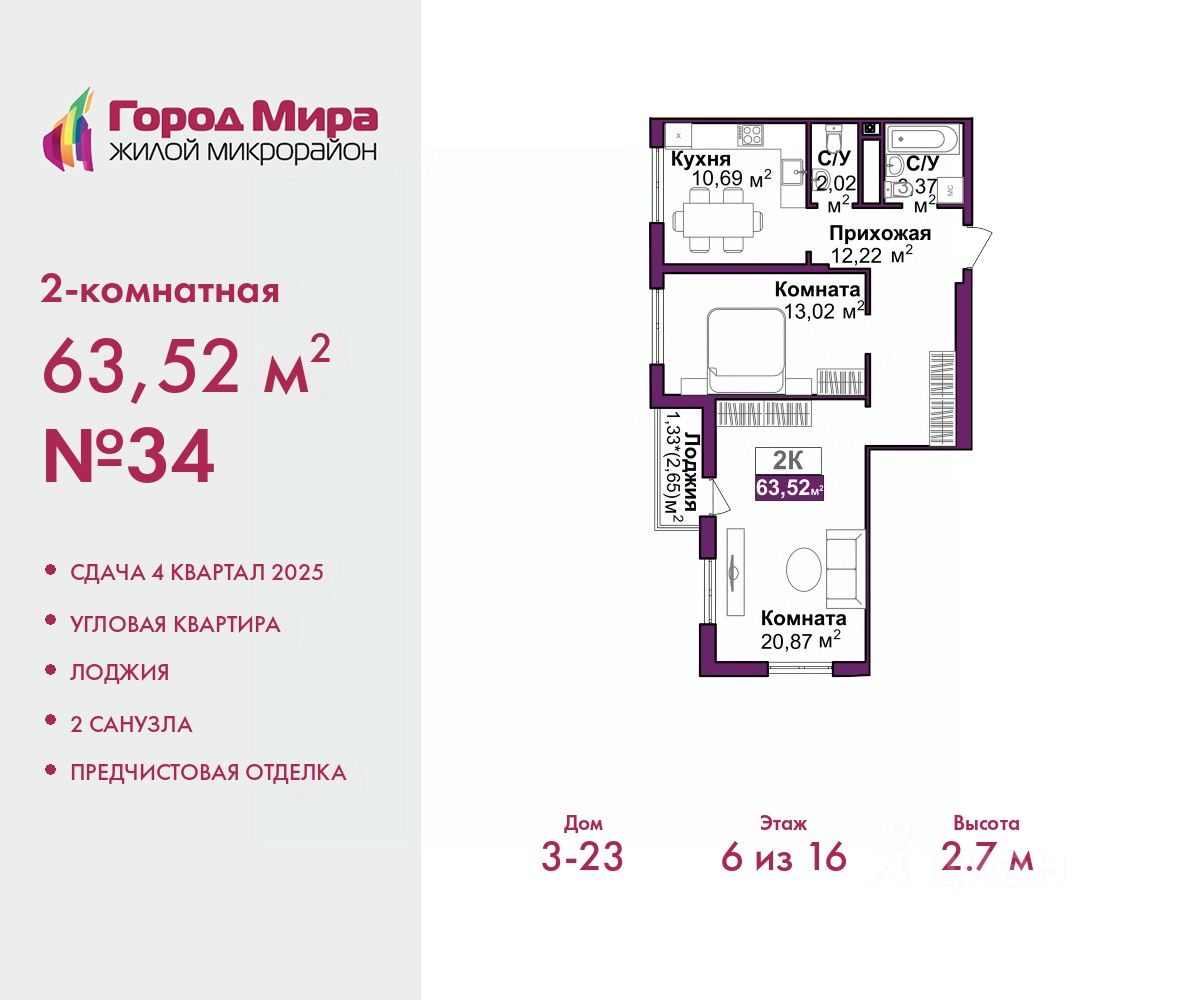 Продается 2-комн. квартира от застройщика с предчистовой отделкой в ЖМ "Город Мира" на 6 этаже. Общая площадь: 63.52 кв.м., жилая: 33.89 кв.м., площадь просторной кухни-столовой: 10.69 кв.м. Квартира угловая, очень светлая, естественная вентиляция при открытии окон. В квартире одна лоджия, один совмещенный и один раздельный санузел. Высота потолков 2.7 м.