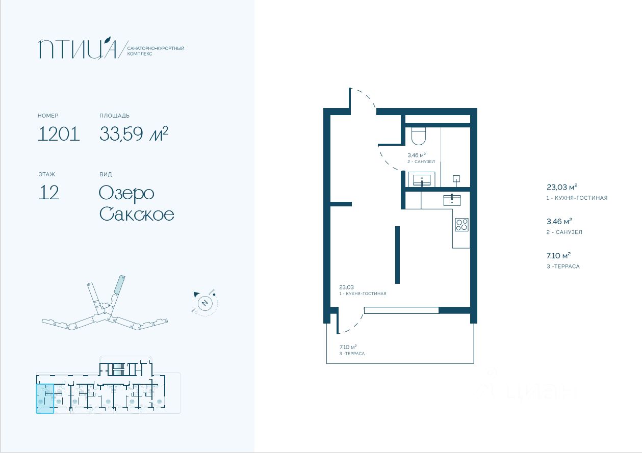Продаётся студия-апартаменты в строящемся доме (Секция А-Ш), срок сдачи: III-кв. 2028, общей площадью 33.59 кв.м., на 12 этаже. Новый гостинично-оздоровительный комплекс "по ул. Морская" от застройщика "СЗ Атлант" расположен по адресу Республика Крым, Саки, Морская улица