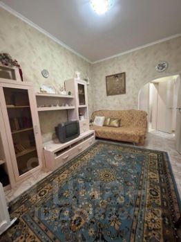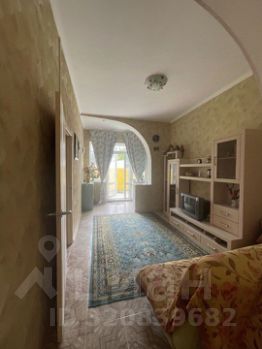 В гостиной, отделенной от входа арочной перегородкой, есть раскладной диван и шкаф с полками.