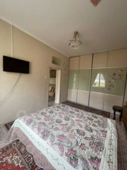 В спальне выстроена целая система хранения с раздвижными дверями-купе; также есть полноценная двухспальная кровать с отличным качественным матрасом.
