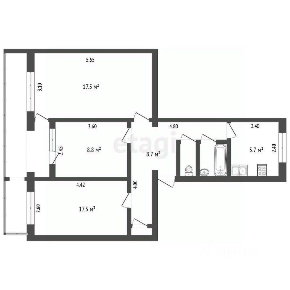 Площадь 55,4 кв. м (без учета балкона 2,4 кв.м. и лоджии 1,3 кв.м).