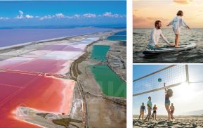 Мягкий климат и бескрайние песчаные пляжи с прозрачной водой уникальный природный ландшафт. Евпатория расположилась на берегу Каламитского залива. С запада курорт омывает Мойнакское озеро с уникальными лечебными грязями, а с востока розовое соленое озеро Сасык-Сиваш. Местные песчаные пляжи одни из лучших во всем Крыму.