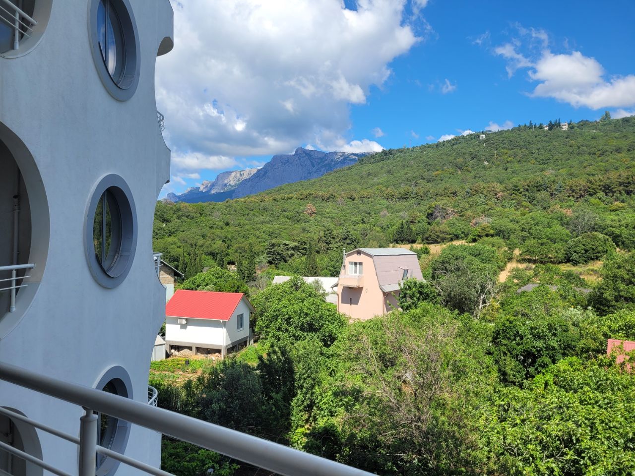 Есть достаточно просторный балкон, который открывает замечательные виды гор, зелени, Ай-Петри.