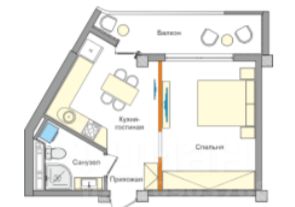 Квартира-студия с выделенной зоной кухни на 4 этаже площадью 34.1 кв м + балкон площадью 6.9 кв м. Согласно планировке кухню с выходом на балкон можно отделить от комнаты.