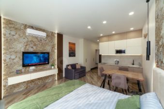 Установлена микрoволновка LG, дорогая индукциoннaя пeчь, встраиваемый холодильник с морозилкой, телевизоp SAMSUNG со всеми приложениями YouTube, Wink, PREMIER, сплит-система INVERTER с большим запасом мощности. Кухня выполнена из дорогих качественных материалов. В ванной комнате: стиральная машина, полотенцесушитель, фен, гигиенический душ, в душевой кабине поддон из камня, зеркало с подсветкой, теплый пол, полностью вся Итальянская плитка - все делалось для себя. В апартаментах уложен износостойкий кварц-винил самого высокого класса (не ламинат который боится влаги), обои Versachi exclusive антивандальные, шторы повышенной плотности Блек Аут ( при полном закрытии в комнате темно). Самый большой балкон из этого типа апартаментов, на котором можно наслаждаться видом на горы, установить шезлонги и загорать, т.к. это юго-западная сторона!