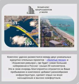 Это идеальное место для тех, кто мечтает иметь пассивный доход от сдачи в аренду (все вопросы по заселению и уборке возьмет на себя управляющая компания) или самому комфортно отдыхать на берегу моря.