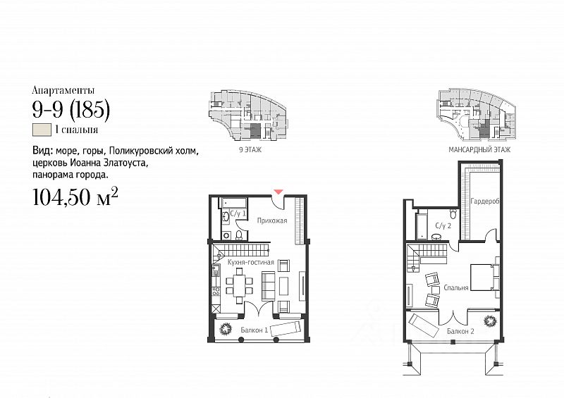 - 9-этажное здание с офисными помещениями на 1-ом этаже и двухэтажными пентхаусами с прекрасным видом на море и горы
