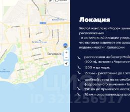 Жилой комплекс "Море" занимает особое для Крыма расположение — в живописной локации у воды, на берегу озера Мойнаки, что выгодно выделяет его среди предложений на рынке недвижимости г. Евпатории;