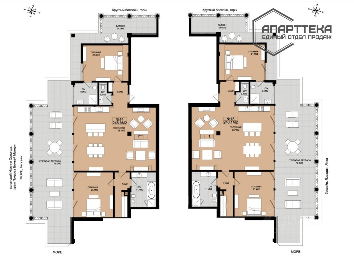 Возможность купить весь этаж - два апартамента с двумя большими террасами и совместить в один пентхаус в апарт-комплексе класса премиум. Вид 360 градусов на: открытое море, горы, хвойный лес, Ялту и ЮБК. Можно рассмотреть приобретение по отдельности: